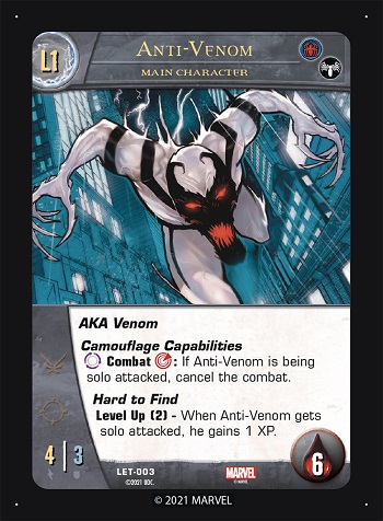 Please note that Agent Venom has a “Level Down” power instead of a “Level Up” power. It works the same as a Level Up power, except he goes down a level instead of up a level (so back to Flash Thompson Level 1).