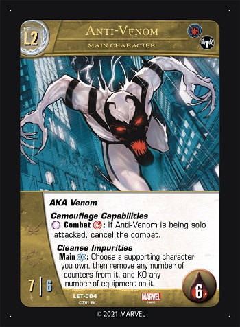 Note that Anti-Venom’s Level 2 Cleanse Impurities works on a supporting character you own, not just on your side. (You own cards that started in your deck or out-of-game piles.) Not surprising that Anti-Venom would be helpful against reptilian headgear…