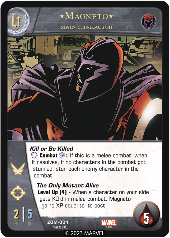 Level Up (6) - When a character on your side gets KO'd in melee combat, Magneto gains XP equal to its cost.