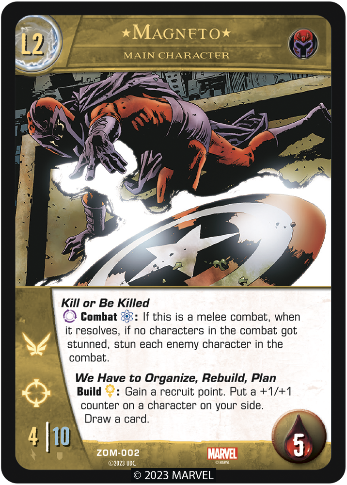 As the last mutant alive, Magneto stands his ground against the zombie invasion with powerful abilities, a steadfast will, and a vision of fighting together. Here is a closer look at the new Level 1 and Level 2 Magneto main character cards: