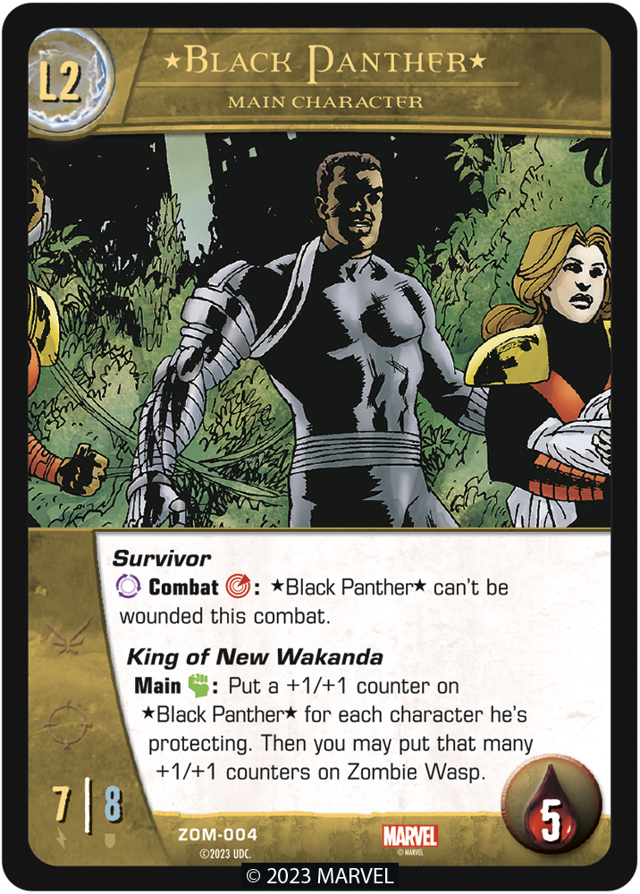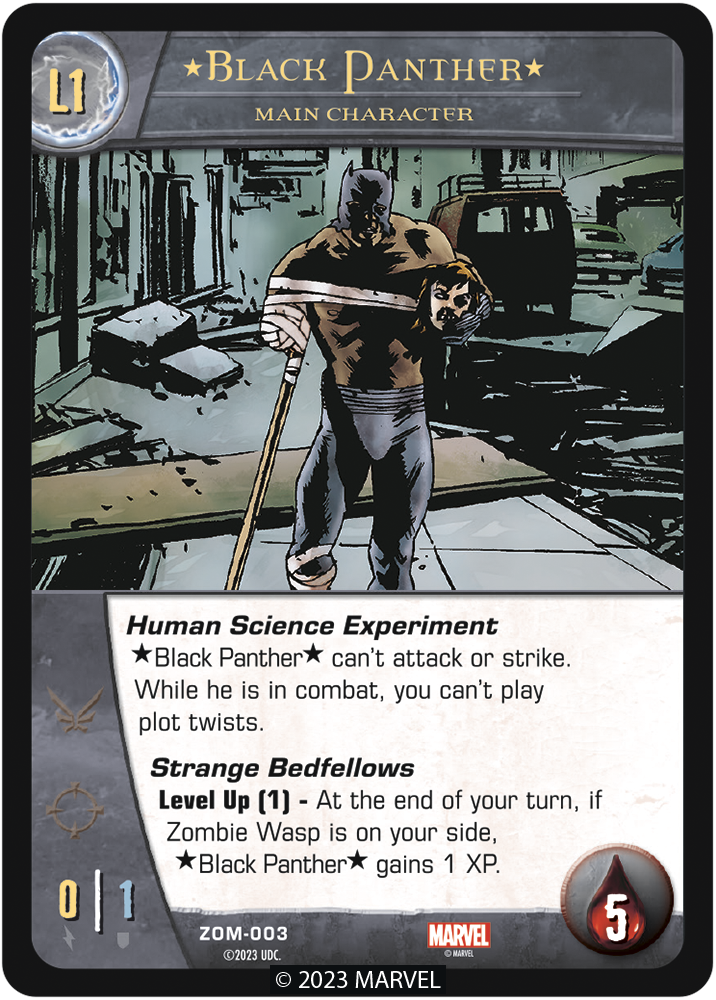 Your other main character in Vs. System® 2PCG®: Marvel Zombies, Black Panther, has teamed up with the animated severed head of Zombie Wasp (yeah, she’s still chatting) to fight back against the virus. After having been harvested for his limbs by Zombie Pym, he has recovered and been restored, ready to protect the universe from the hordes. Check out the new Level 1 and Level 2 main characters cards for the King of New Wakanda: