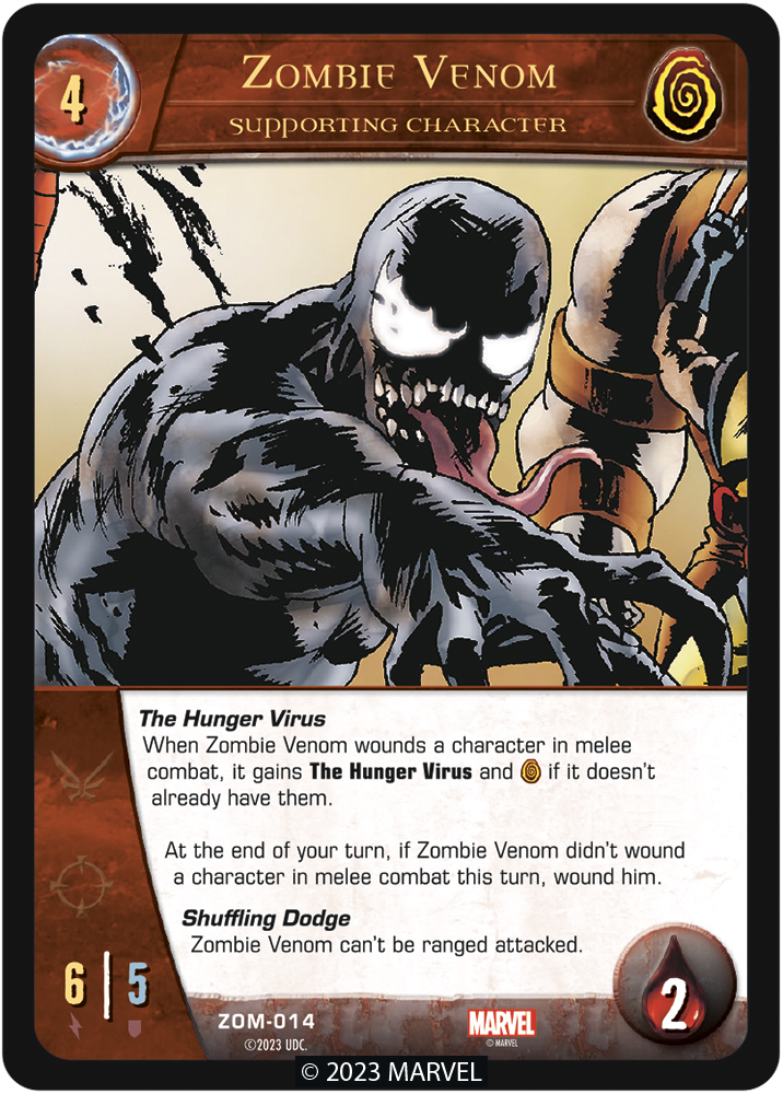 When Zombie Venom wounds a character in melee combat, it gains The Hunger Virus and [ZOMBIE] if it doesn't already have them.