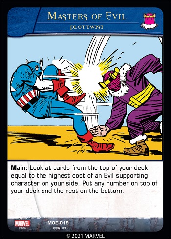 Like other team-specific plot twists, the Masters of Evil’s plot twist, Masters of Evil, requires you to have a face-up Masters of Evil character.