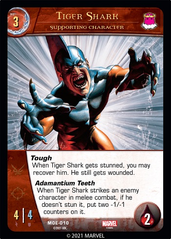 Here’s an example of how Tiger Shark’s Adamantium Teeth works: If Tiger Shark strikes a 5/5 character and doesn’t stun it, Adamantium Teeth will put two -1/-1 counters on it, making it a 3/3 at the end of combat. (Note: Tiger Shark’s strike will either stun a character in combat or put two -1/-1 counters on it, but not both.)