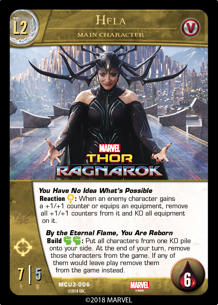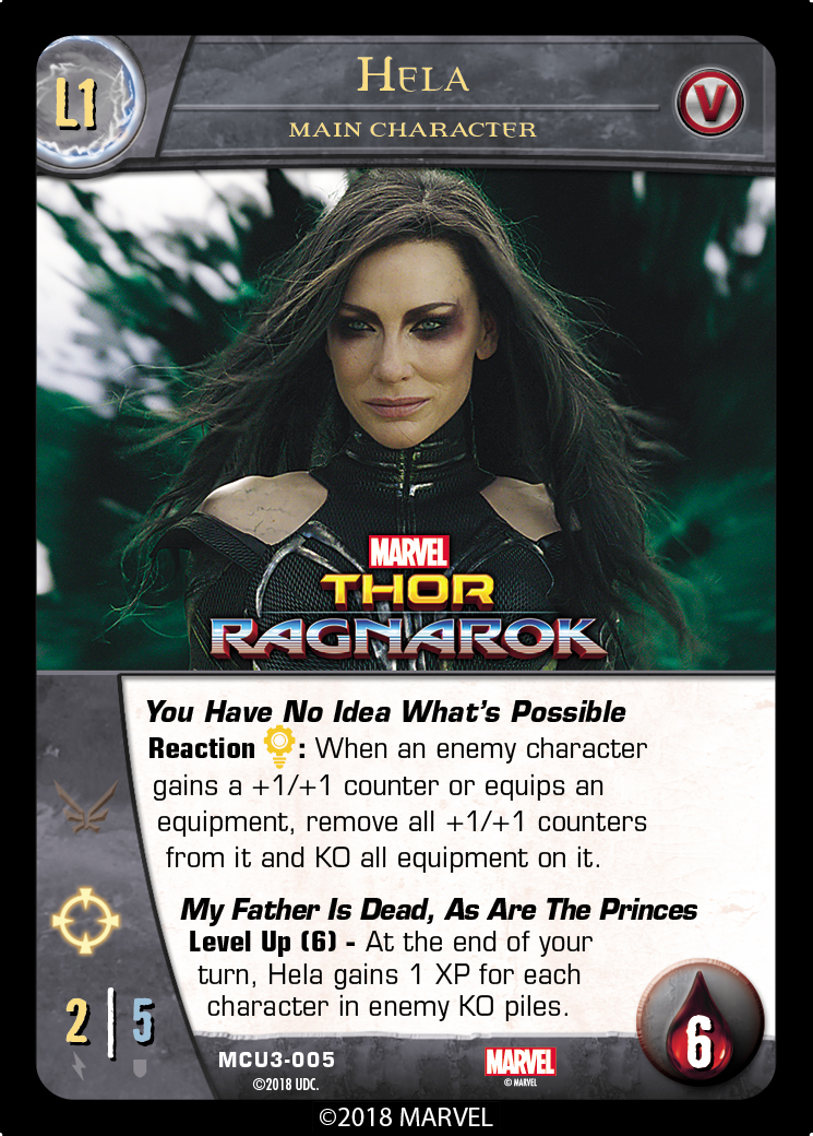 For our next preview of Vs. System® 2PCG®: MCU Villains we’re going to focus on some characters who don’t want you to have things. Let’s get started with the goddess who broke Mjolnir: