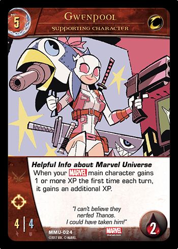 Gwenpool knows she is in a comic book (and card game) and loves to break the fourth wall. So she can really be helpful about the Marvel Universe. Marvel main characters are characters that are…never mind, you all know what that means.