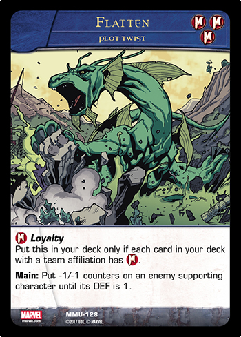 BOOM! No matter how big a supporting character gets, Flatten will reduce it to 1 DEF, where it will make an easy target to finish off.
