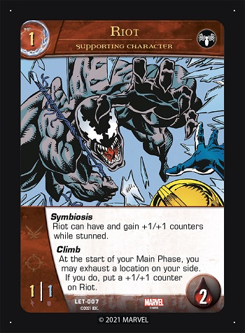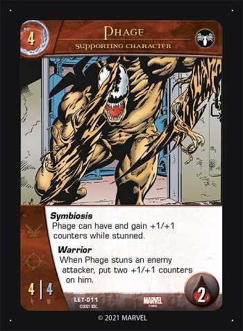 “During your Build Phase, if you have four supporting characters in your KO pile with the names ‘Agony’, ‘Lasher’, ‘Phage’, and ‘Riot’, you may put Hybrid from your hand onto your side.”