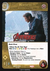 OK, what the heck is a Nest? Well…when you spend a power symbol from a Location in your resource row to put Hawkeye into a Nest, you put the Location card partly underneath him and leave it face up as the Nest. (Note that if you pay for the power by discarding a Location or you reduce the cost of the power to zero power symbols, nothing happens.)