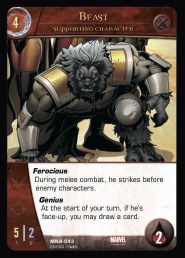 Supporting Characters have the same elements as Main Characters, except they have a cost in the top left instead of a Level Number. Supporting Characters don’t get Level Up Powers, but Beast has a couple of Keyword powers. Unlike other types of powers, Keyword powers often show up on multiple characters.