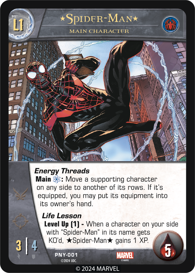 Our friendly neighborhood heroes all bring their own unique traits to battle. Here is a preview of Level 1 and level 2 Main Characters *Spider-Man* also known as Miles Morales. Using his unique Energy Threads, Miles is able to swing both allies and enemies between rows and even capable of disrupting their equipment.