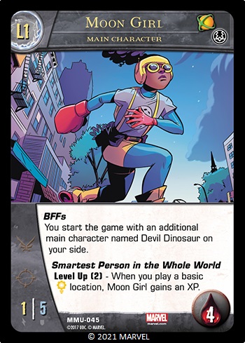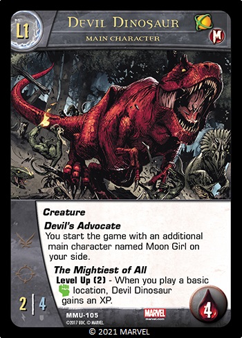 Example: Moon Girl says “You start the game with an additional main character named Devil Dinosaur on your side.”