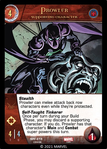 Once per turn, during your Build Phase, you may discard a supporting character. If you do, Prowler has that character’s printed Main and Combat super powers this turn.