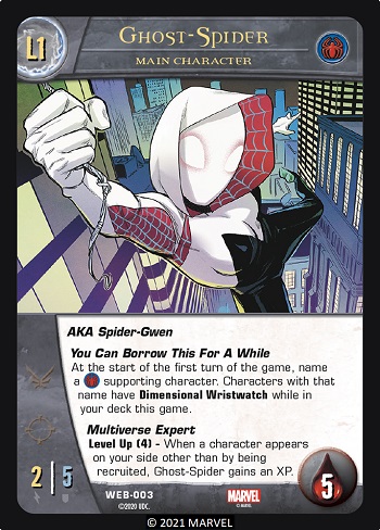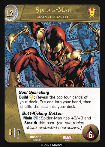 Scarlet Spider: During Step 2 you’ll reveal Scarlet Spider as your main character. Then during Step 4 you’ll announce that you have his Spider-Web pile and follow his game text instructions to put a different main character onto your side.