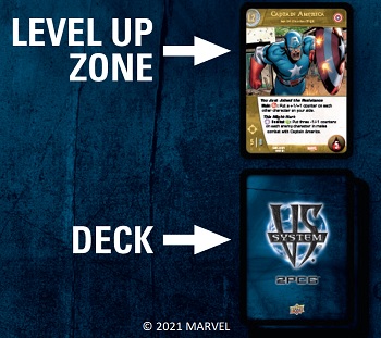 You may be wondering what the practical difference is between a card being in the Level Up Zone and being in an out-of-game pile. In the vast majority of cases, it doesn’t really affect anything. One place where it does matter, however, is that cards in your Level Up Zone are allowed to have their own out-of-game piles. On the other hand, a card that starts in an out-of-game pile is NOT allowed to have a pile of its own. (See Out-of-Game piles below.)
