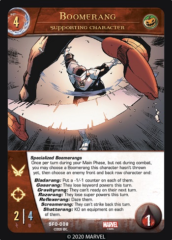 Each turn Boomerang can “throw” a boomerang that Boomerang hasn’t already thrown this game. For example, if Boomerang throws a Gasarang on one turn, he can’t throw a Gasarang on a later turn. (This restriction only applies to this copy of Boomerang. If you play another Boomerang or if this Boomerang leaves play and comes back, it will reset the restriction.)