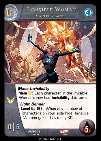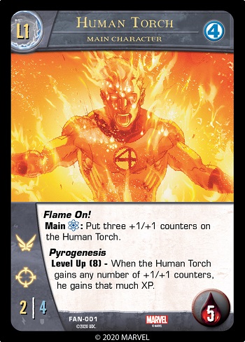 Note that he does gain XP for supporting and main characters, and on both sides. But if there are more than one of a specific character on all sides (for example, you and an enemy player each have a Human Torch on your sides), he will only gain 1 XP for Human Torch.