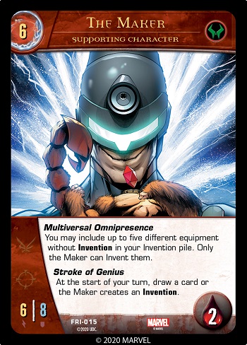 If the Maker is in your deck, you get to have the usual Invention pile, plus you can add up to five Equipment to it. They must be different cards (same name but different game text is fine) and can’t already have the Keyword Invention. (You can also include copies of those Equipment in your deck if you like, and the copies in your Invention pile don’t count against them. For example, you can have a One of a Kind Equipment in your deck and the same one in your Invention pile.)