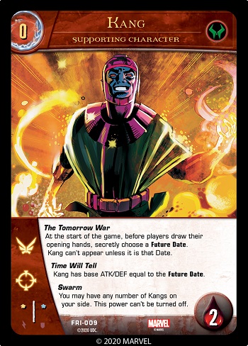 If any number of Kang supporting characters are in your deck, The Tomorrow War lets you pick a single Future Date before players draw their opening hands during setup. You must tell your opponent that you are doing this but keep your choice secret!