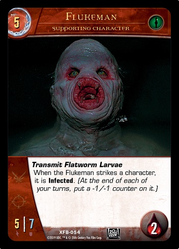 If the Flukeman in on your side and he Infects a character, this means at the end of each of your turns, put a -1/-1 count on that character. The character will remain Infected until it leaves play. (Flukeman leaving play will NOT end the Infection.) A character can be Infected more than once, and will receive a -1/-1 counter for each instance of the infection. And yes, a Main Character can be Infected.