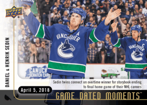 In an improbable Hollywood style ending in Vancouver, Henrik Sedin shuffles the puck from the corner back to his brother Daniel who aims and zips the puck past the Coyotes’ goalie to score their final OT goal in front of the uproarious applause of the home crowd as the Sedin twins further cement themselves in Canucks’ franchise history.