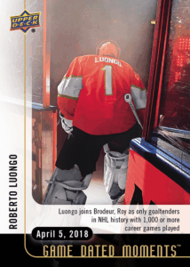 Card #72 (April 5, 2018) – Luongo Becomes 1 of 3 Goalies in NHL History to Reach 1,000 Games