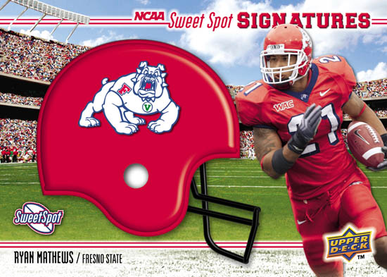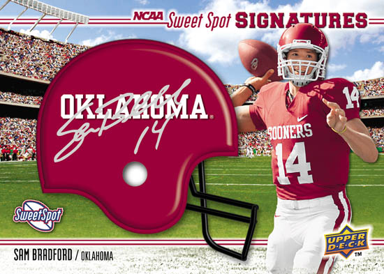 What’s cool is that all of these first-year players will be appearing in Upper Deck’s fast-approaching 2010 Sweet Spot Football set, which is scheduled to launch next month right around the same time as Monday Night Football. All of the aforementioned rookies will be appearing in the set and every one of them will have autographed helmet cards to boot!