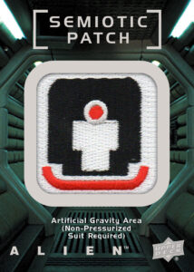Another fun insert set are the Semiotic Patches based on Ron Cobb’s symbols that are featured all throughout the Nostromo. The one below is the symbol on the ship for an artificial gravity area and lets the crew know they need a specific suit to enter the area. Many others of these are featured in the set, including ‘High Radioactivity’.