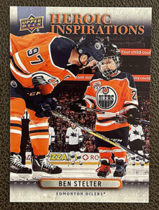 A limited amount of Ben’s cards will be given out at tonight’s Oilers game against the San Jose Sharks. The Upper Deck company is honored and thrilled to have Ben Stelter be featured on one of our Heroic Inspirations cards.